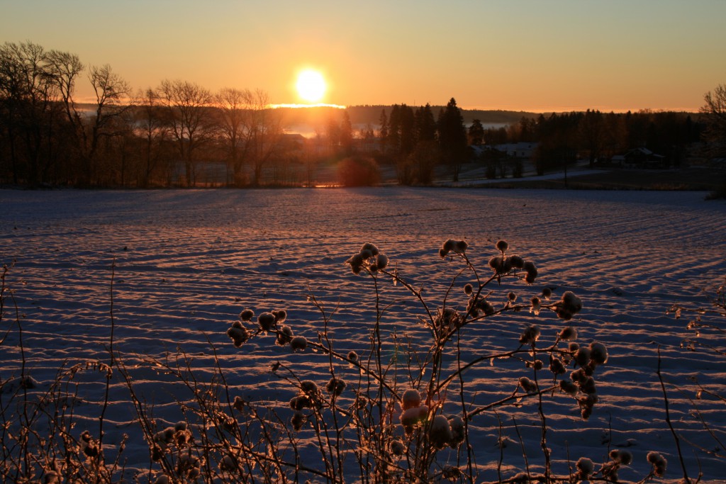 Det er en nydelig dag, dette – med skyfri himmel og temperatur rundt ti minusgrader. Før jeg går ut, registrerer jeg imidlertid at termometeret hjemme – som akkurat da er utsatt for direkte solpåvirkning – viser null grader. Og jeg merker det mens jeg går; at sola faktisk «tar» litt, selv nå i slutten av desember. Samtidig står den lavt på himmelen, sola – og det er ikke mange lyse timer igjen av dagen når jeg starter turen. Men vakkert er det definitivt, med det gyldne desemberlyset. Noe også kamerabruken under turen bærer preg av. Det blir på mange måter en «jakten på lyset-tur», dette;