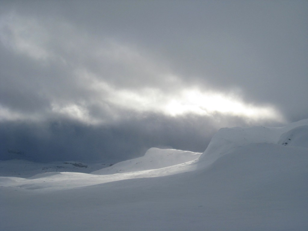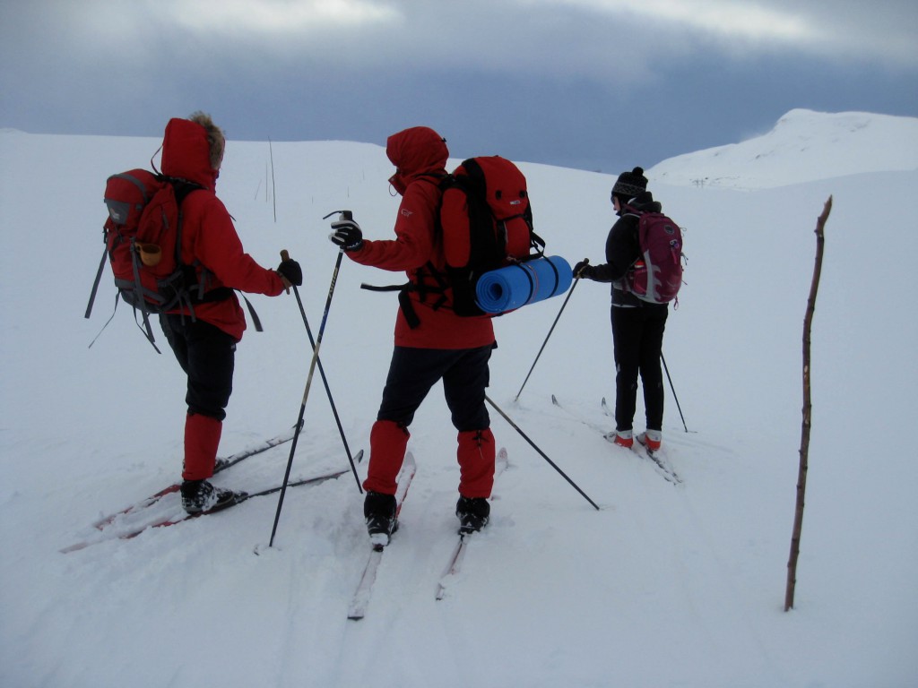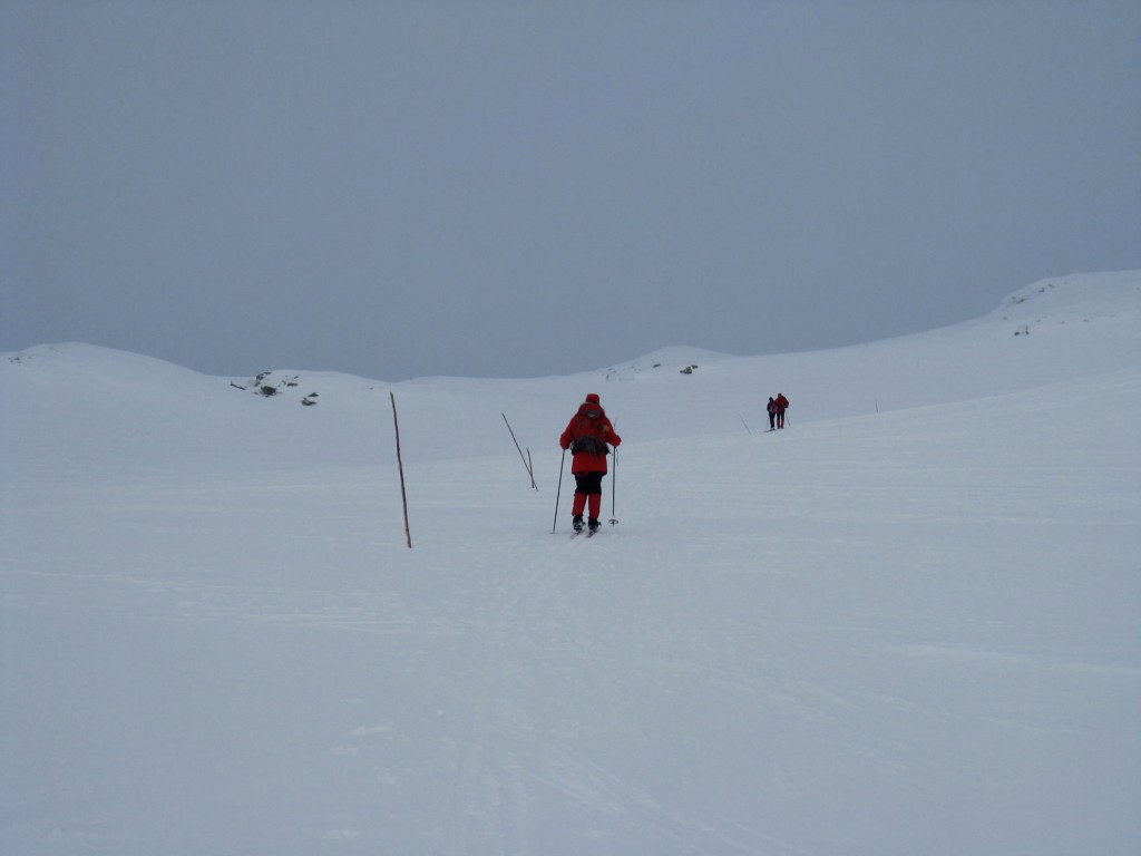 Enn stille? Helt stille er det dog ikke. Det blåser ganske friskt, og værforholdene samt det faktum at mørket snart vil falle på, gjør at damene «avblåser»(!) planen om å gå inn til Klemsbu, nødbua som ligger inne i nasjonalparken, 1600 m.o.h. Men et stykke i retning Klemsbu går de i alle fall før de snur.