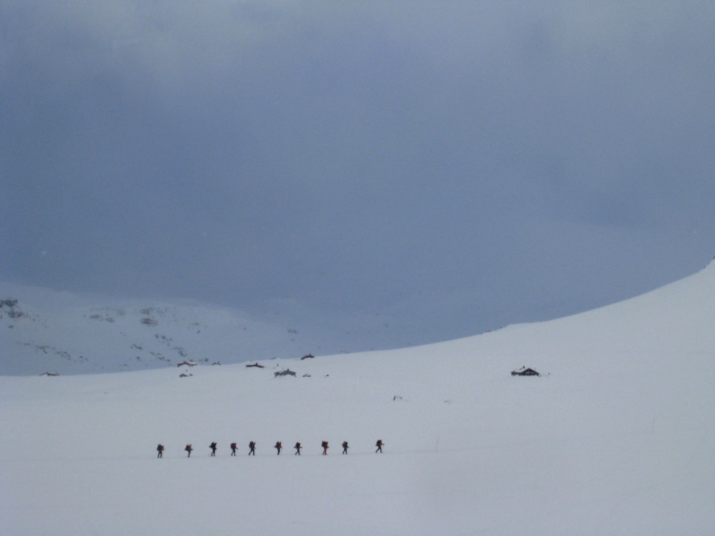 Selv om været er så som så og det etterhvert er sen ettermiddag, er det et ganske yrende liv i området rundt Finse stasjon. Blant annet er et stort følge med skigåere (bildet viser ikke alle) på vei over Finsevann i retning vestover.