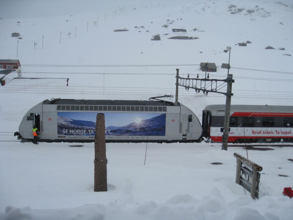 NB! Det er ikke dette toget damene tar; da ville de ha havnet i Bergen (noe som er upraktisk når man bor på Østlandet). Dette er kun et «illustrasjonsfoto» tatt fra hotellvinduet lørdag ettermiddag 🙂