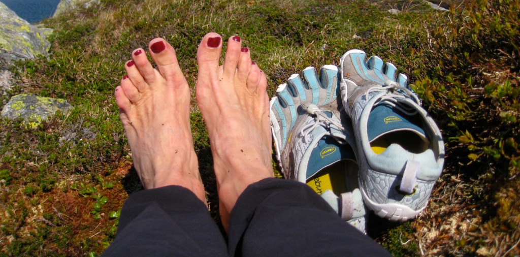 Bare en gang underveis finner jeg grunn til å være litt betenkt over å gå alene. Det skjer når jeg skal krysse en elv mellom Bossbu og Stavskar, og jeg oppdager at snøbrua jeg gikk over på vei inn dagen før, har rast sammen. Å krysse elva langs den ordinære T-merkede ruta er heller ikke mulig, fordi store snøskavler ligger ut over elvebredden på begge sider. Jeg går et par hundre meter nedover langs elva og finner til slutt et sted som ser egnet ut for kryssing. Men bare nesten egnet, skal det vise seg. Når jeg begynner «overfarten», oppdager jeg fort at avstanden mellom steinene jeg trår på, er i overkant stor enkelte steder. Det går ikke bedre enn at jeg bommer på en stein – eller det vil si, jeg treffer den – men på en ganske ublid måte. Etter først å ha mistet balansen, «stuper» jeg framover og treffer steinen med kneet. Dermed må jeg snu, finne fram plaster og ta meg en liten tenkepause. Den ender med at jeg bestemmer meg for vading. Elva er stri, men ikke verre enn at vading er helt greit. Etter et raskt skobytte – fra fjellstøvler til fivefingers (!) går vadingen som en lek. Og ettersom jeg nå engang elsker disse rare «fingerskoene» blir jeg gående med dem enda en halvtimes tid, helt til beina er blitt så kalde av all snøflekk-kryssingen at jeg må bevilge dem en opptiningspause i sola.